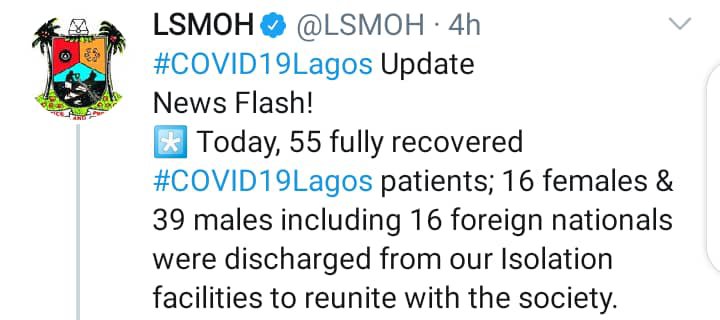 The Lagos State Government has discharged 55 Covid -19 Patients from the various isolation centres in the state after they tested Negative to the highly dreaded corona virus infection.