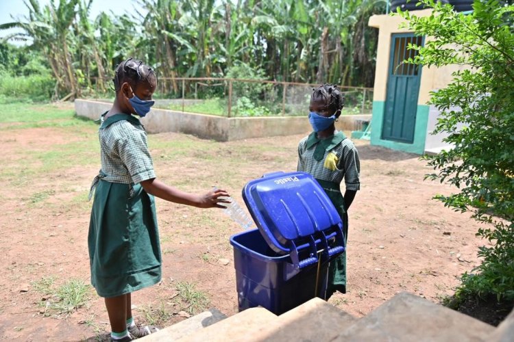 Learners at St Paul’s Anglican School, Orile Imo, Obafemi Owode, Ogun State, using one of the waste bins donated by Nestlé Nigeria PLC to their school during the sustainability training.