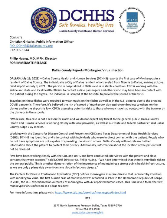 MONKEY POX VIRUS REPORTED IN DALLAS Posted bydaranetworktvJul 17, 2021Posted inHealth, Home, News 17/07/21 DANIELS G.O PRESS RELEASE Share this: Click to share on X (Opens in new window) X Click to share on Facebook (Opens in new window) Facebook Like Loading... Related Published by daranetworktv An Online Platform Built On Intergrity For your reliable News ,Health Issues,Solutions And More View more posts
