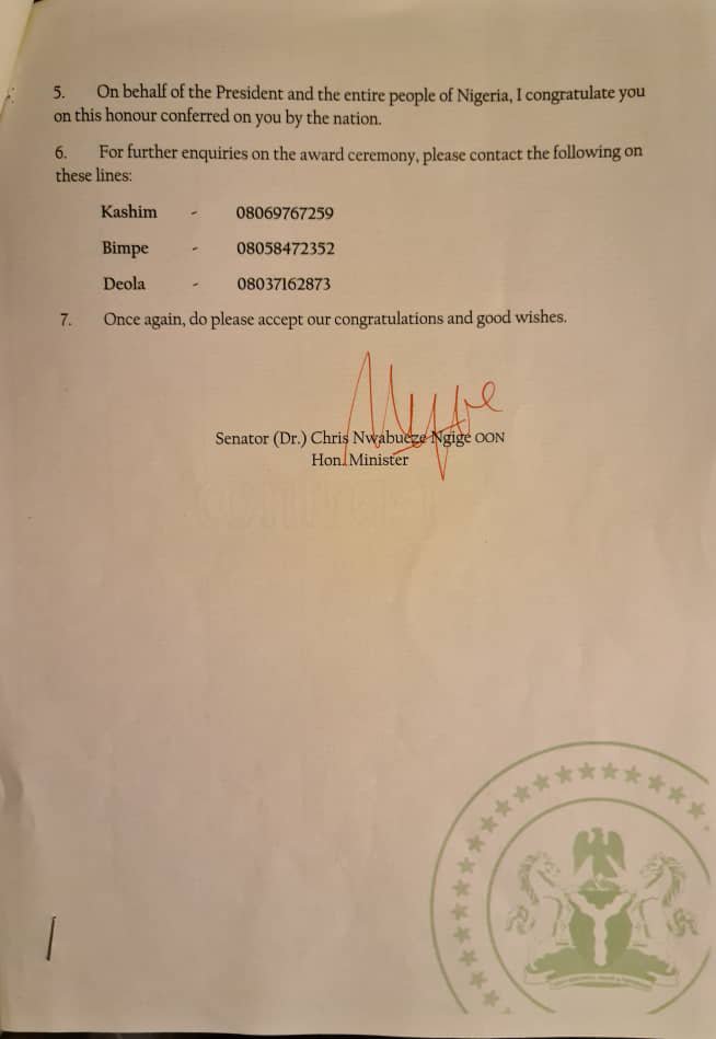 The letter personally signed by the Minister reads in part, “The President of the Federal Republic of Nigeria, Muhammadu Buhari, GCFR has approved the conferment of the National Productivity Order of Merit (NPOM) Award on you in recognition of his high productivity, hard work and excellence.