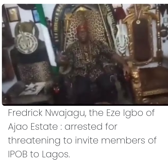 The Lagos State Police Command has confirmed the arrest of Eze Ndigbo of Ajao estate, lagos state Frederick Nwajagu over a viral video posted on Friday where he had disclosed his intention to invite members of the Indigenous People of Biafra, IPOB to protect lives and property of the Igbo people residing in the state .