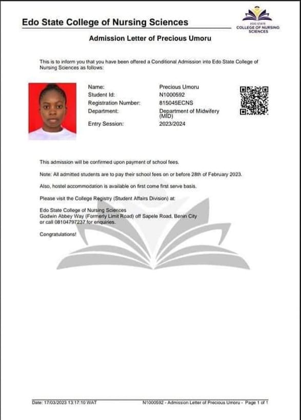 The Edo State Governor, Godwin Obaseki, has ordered the re-assessment of Precious Umoru on Thursday, April 13, 2023 to begin her training at the Edo State College of Nursing Sciences, Benin City, the Edo State capital.