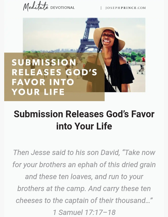 David was at the right place at the right time because he humbled himself and submitted to his father’s instructions to deliver bread and cheese to his brothers. Beloved, this is something you need to understand. Submission to God-appointed leadership will always cause God’s favor to flow in your life, and you will find yourself, like David, at the right place at the right time!