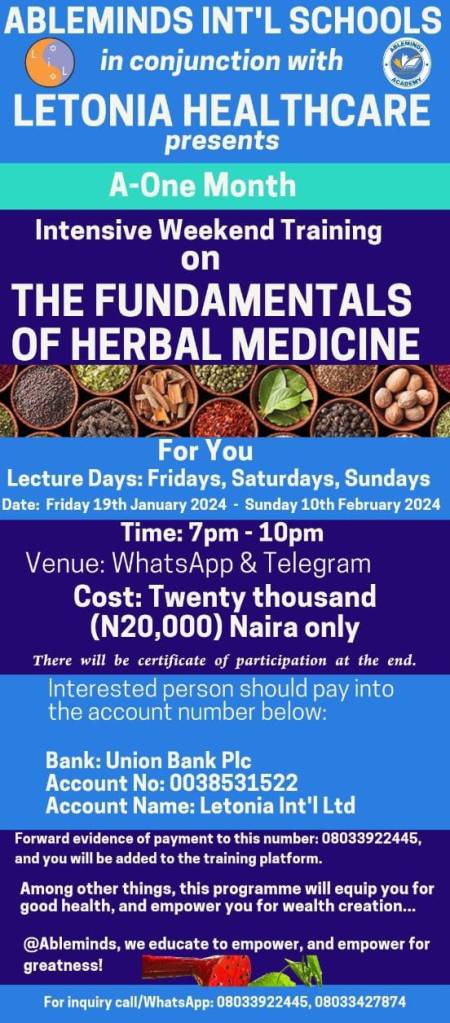 A proper knowledge of herbs is important for good health, which is a prerequisite for wealth creation — and this is what this programme on the Fundamentals of Herbal Medicine achieves — to make you healthy and wealthy.