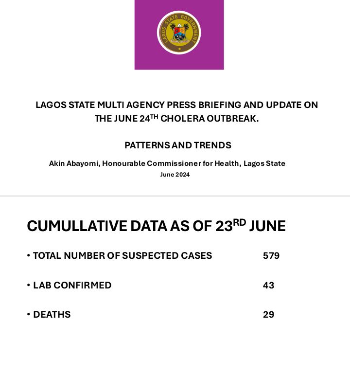 Latest Update Coming From The Lagos State Commissioner For Health Professor Akin Abayomi on the Cholera Outbreak says there are now a total of 579 Suspected Cases of Cholera in the state,43 Laboratory Confirmed Cases and 29 Deaths