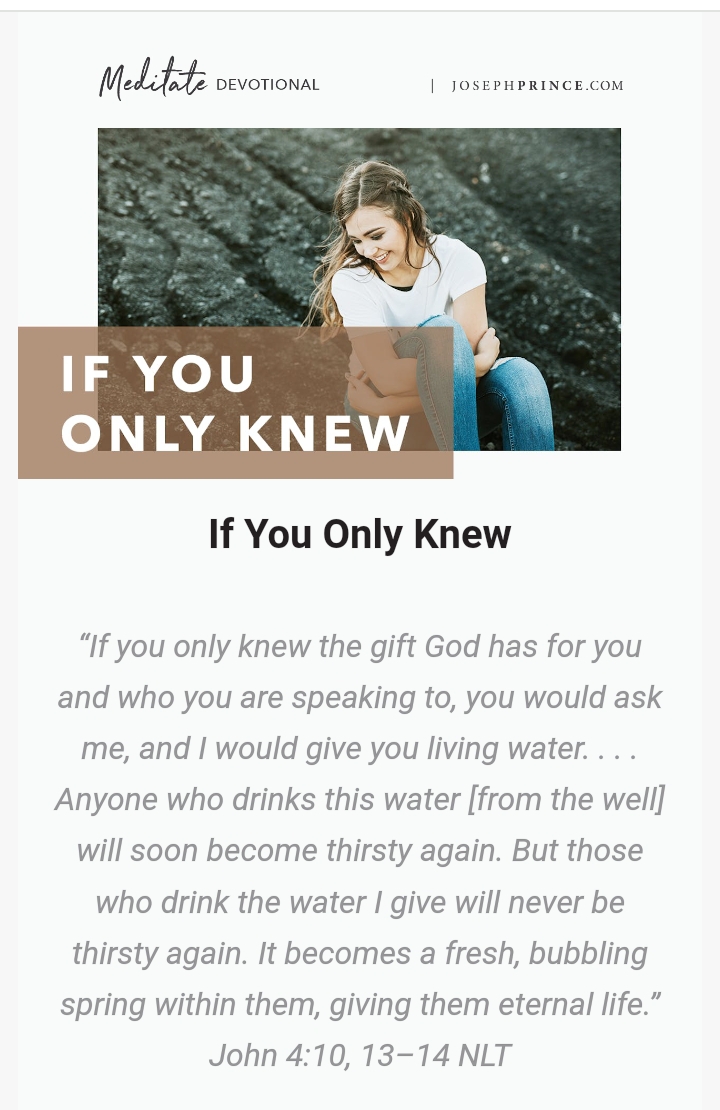 Beloved, if you only knew this gift of God who offers the living water of His unconditional, endless love to you and you drink of that love, you will never thirst again. You won’t need to look for love or acceptance in all the wrong places, have your heart broken and fearful about the future, and have your life derailed. You can wake up with a fresh expectation of good every day.