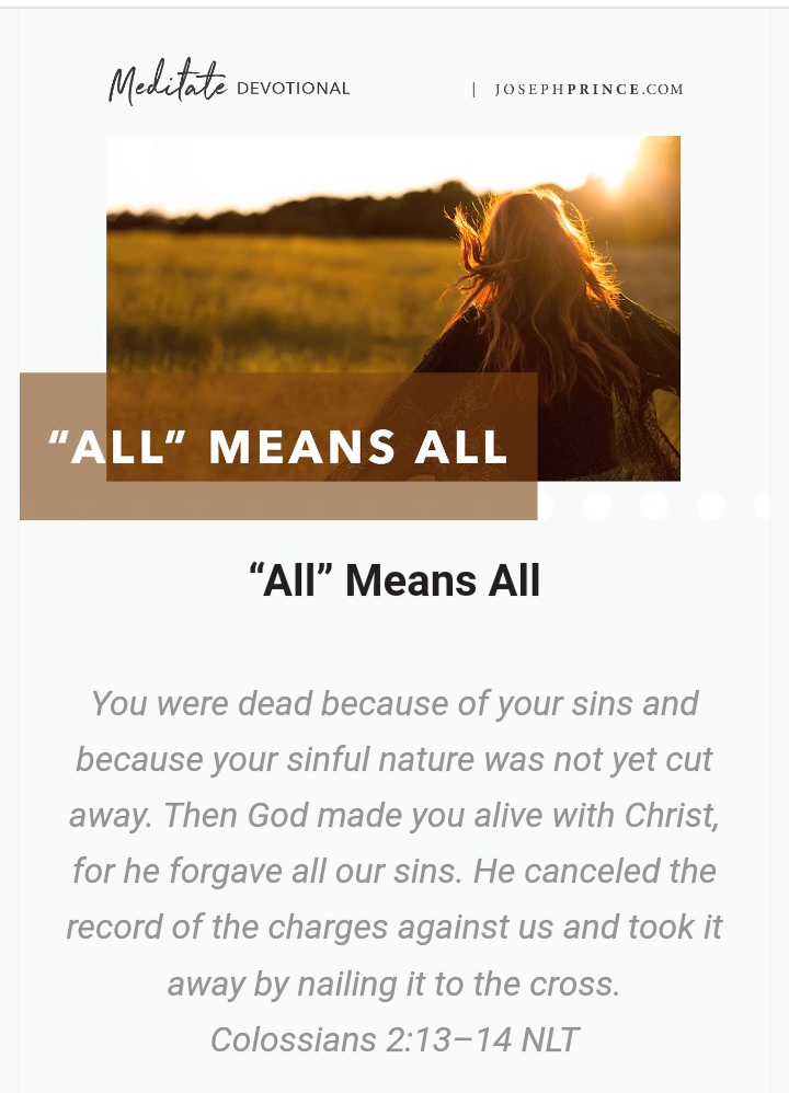 Next, I want you to consider today’s Scripture. Colossians 2:13–14 declares that Jesus forgave all our sins! The word “all” is the Greek pas, meaning “every kind or variety . . . the totality of the persons or things referred to.” It refers to “all, any, every, the whole.”