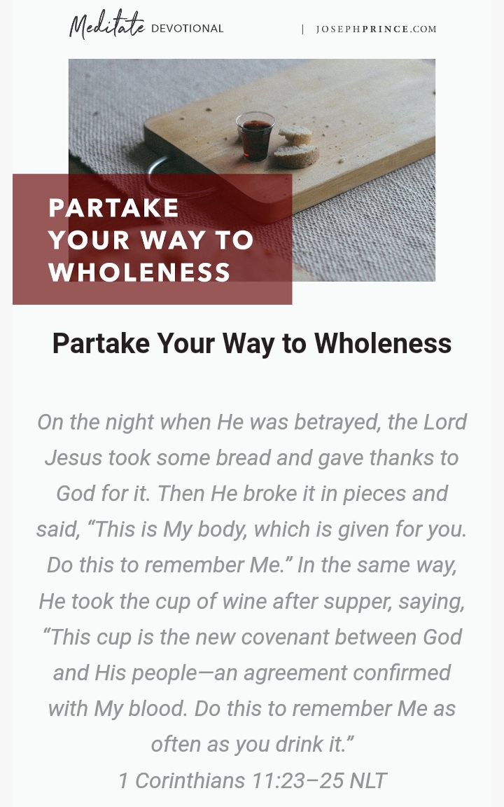 Likewise, when you partake of the cup, remember that Jesus shed His blood to save you. Say, “Jesus, thank You for Your shed blood that has washed away my sins and made me righteous. Because I am righteous in Your sight, healing belongs to me. I receive Your healing and resurrection life for my body right now.”