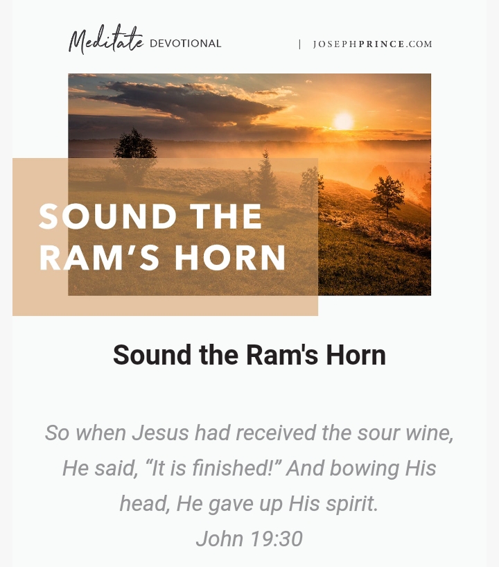 The ram’s horn is a beautiful picture of the death of our Lord Jesus. The ram had to die for the horn to be obtained. The sounding of the ram’s horn is thus a proclamation of our Lord’s death and finished work. At the cross, when Jesus had paid fully for all our sins with His blood, He proclaimed, “It is finished!”