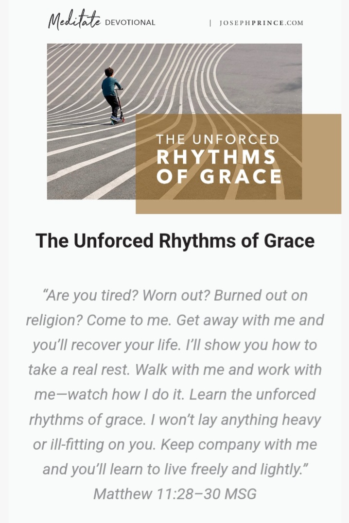 When Jesus spoke of “the unforced rhythms of grace,” He means that there is an ease and enjoyment when you walk in His grace. This is in contrast to the struggle and strain found in self-effort. There is such rest when you know there is nothing you can do to earn His forgiveness.