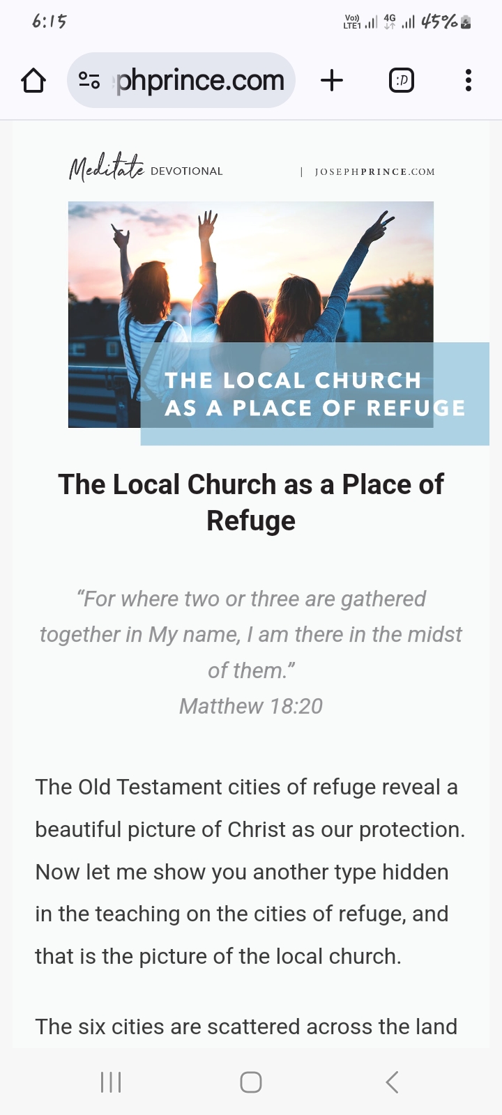 The six cities are scattered across the land so a person can flee to the nearest one to take refuge. It is a picture of local churches scattered all around the world. The local church, my friend, is a place of refuge.