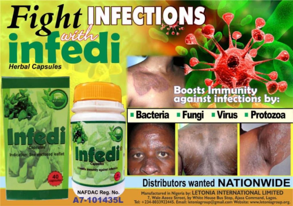 Infedi capsule is a herbal immune booster with broad-spectrum antimicrobial activities and immunomodulatory functions. Scientifically researched for Evidence-based practice and thoroughly formulated for result-oriented outcome to meet our health needs, Infedi capsules make optimum condition attainable when used rationally.