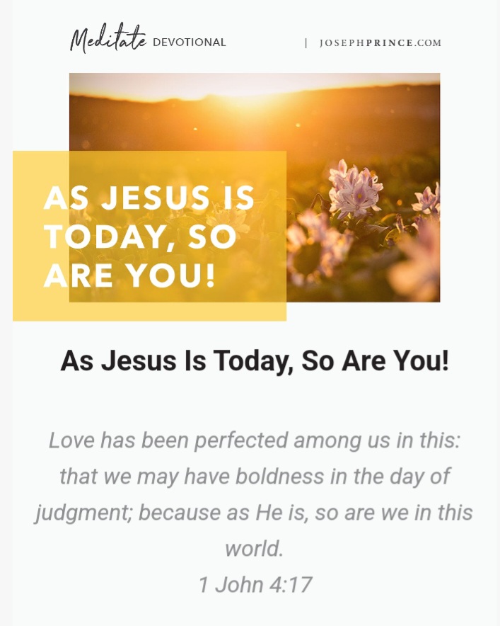 It is wonderful to know that God does not measure and judge you based on your performance today. Instead, He looks at Jesus, and as Jesus is, that is how He sees you. His Word declares that “love has been perfected among us in this: that we may have boldness in the day of judgment; because as He is, so are we in this world.”
