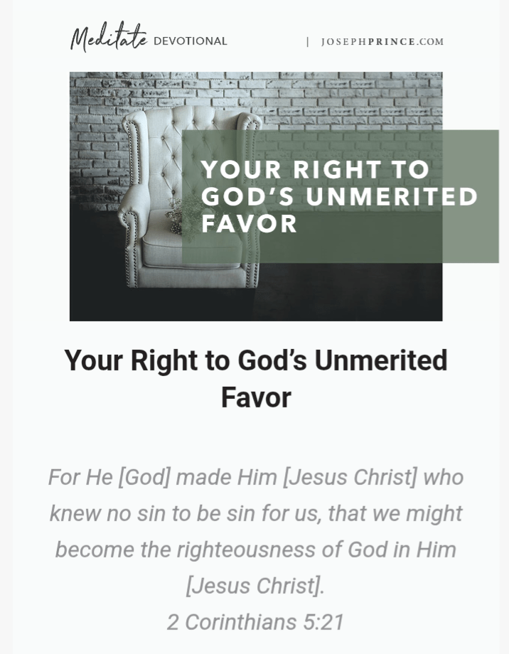 Your righteousness in Christ is the sure foundation on which you can build your expectations to receive God’s unmerited favor. God sees you through the lens of the cross of His Son, and as Jesus is today deserving of blessings, peace, health, and favor, so are you (1 John 4:17)!