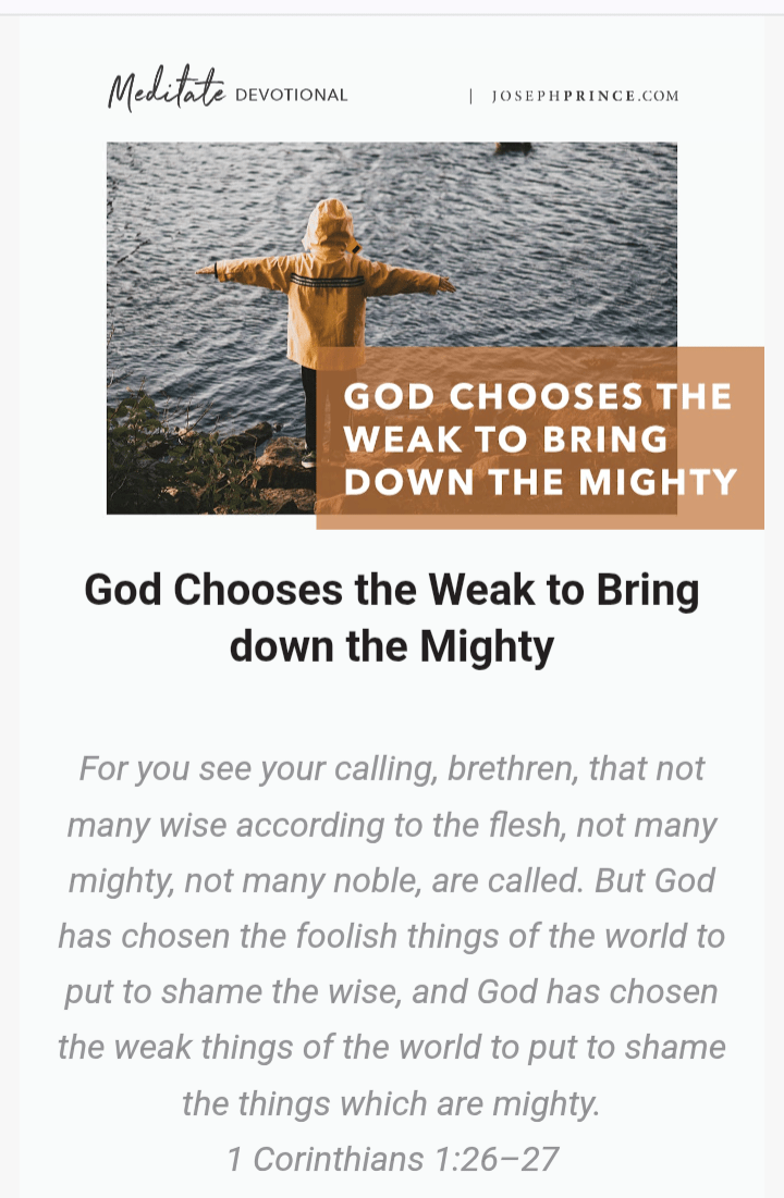 Let’s see in the next verse what God chooses instead: “God has chosen the foolish things of the world to put to shame the wise, and God has chosen the weak things of the world to put to shame the things which are mighty.” In His hands of grace, the foolish and weak things become even wiser and mightier than the wise and mighty things of the world!