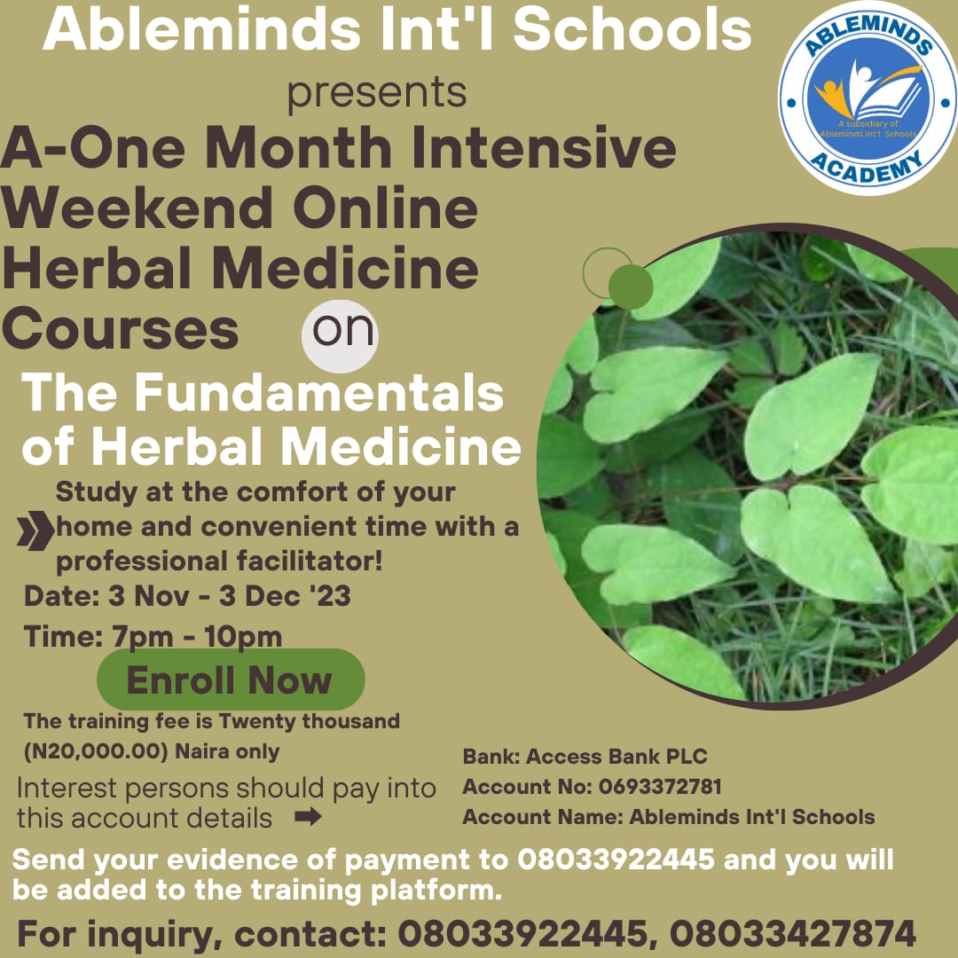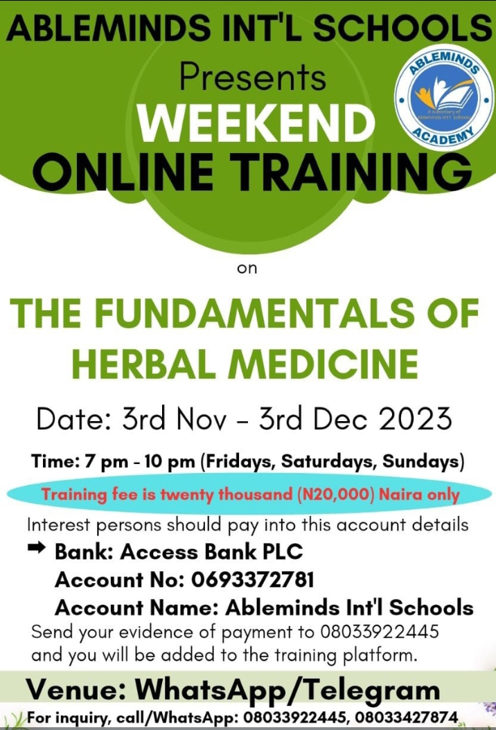 23/10/23 Opportunity goes to those who prepare for it. Here comes the golden opportunity for one to be trained in The Fundamentals of Herbal Medicine with just N20k in 2023! This training is a life-changing one with priceless values and enormous benefits. And the good news? The training will take place simultaneously on WhatsApp andContinue reading “FUNDAMENTALS OF HERBAL MEDICINE:OPPORTUNITY GOES TO THOSE WHO PREPARE FOR IT.”