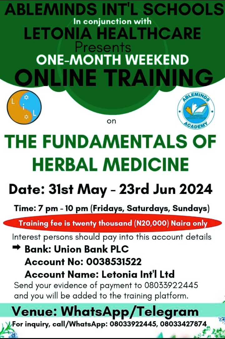 08/05/24 Did you miss our previous programmes? Don’t worry! Another Opportunity Is Here to be trained on the Fundamentals of Herbal Medicine, which is the bedrock of our Indigenous Medicine. A new session will start this month on Friday 31st May 2024. Opportunity goes to those who prepare for it, so adjust your schedules andContinue reading “ANOTHER OPPORTUNITY IS HERE AGAIN !”