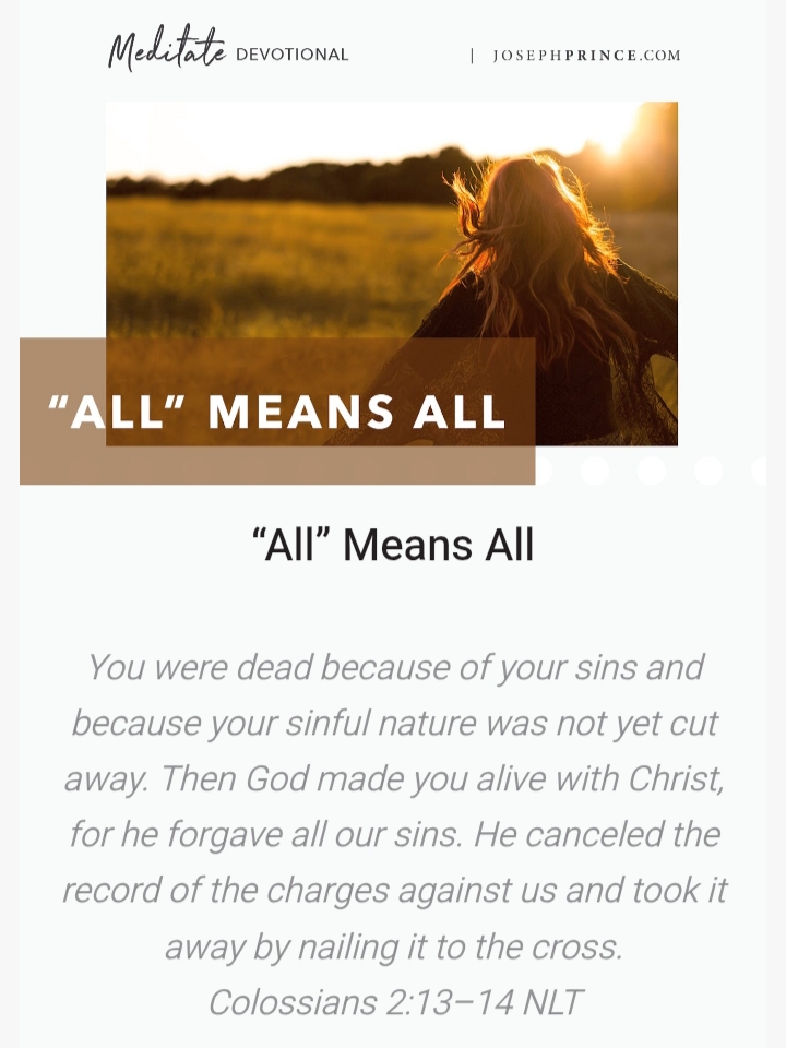 Gospel Corner 27/09/25 When I preach on our total forgiveness in Christ, someone will inadvertently ask, “But Pastor Prince, if all my sins are forgiven, that means my future sins are too. But how can my future sins be forgiven?” Well, that’s a great question. The reality is, when Jesus died on the cross twoContinue reading “So “all” means all. God’s forgiveness of our sins covers every sin—past, present, and future! When we received the Lord Jesus as our Savior, we received the total and complete forgiveness of all our sins.”