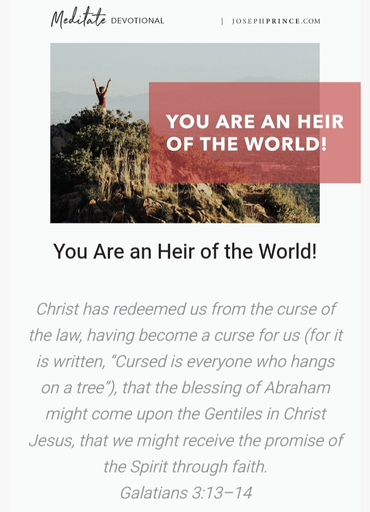 Now, that is what you are an heir to through Jesus’ finished work! In Christ, you are an heir of the world—its goods, its endowments, its riches, its advantages, and its pleasures. This is THE promise that God made to Abraham and his seed. Don’t apologize for it. It is your inheritance in Christ!