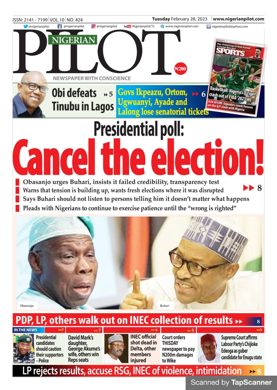 28/02/23 Shina J.O Breaking News: PDP, LP, ADC calls for immediate cancellation of 2023 Presidential election results,Calls For A Fresh Election The People’s democratic party, PDP, the LABOR PARTY, LP and the African democratic Congress, ADC have called for the immediate cancellation of the 2023 Presidential election held on Saturday 25th February 2023. The partiesContinue reading “Breaking News : PDP, LP, ADC Calls for Immediate Cancellation Of 2023 Presidential Election Results”
