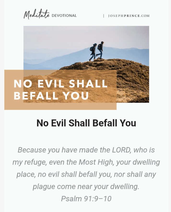 As God’s beloved child, you are in the world, but not of the world (John 17:11, 16). No plague, no evil, and no danger can come close to you and your dwelling place because you are safe in the secret place of the Most High.