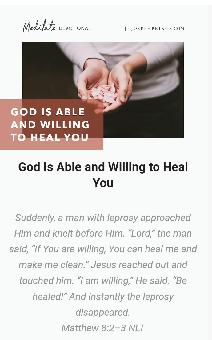 05/11/23 Once, there was a man with leprosy who came to Jesus saying, “Lord, if You are willing, You can make me clean.” This man didn’t have a problem believing that Jesus had the ability and power to heal him. He just wasn’t sure if Jesus was willing to do it for him. I wantContinue reading “GOSPEL CORNER: TODAY, GOD WANTS YOU TO KNOW THAT HE IS BOTH ABLE AND WILLING TO HEAL YOU. “