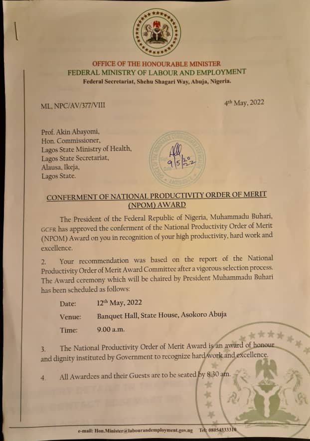 12/05/22 DANIELS G.O LAGOS HEALTH COMMISSIONER BAGS NATIONAL AWARD …Dedicates Award to Mr. Governor, Health Workers and Lagosians The President of the Federal Republic of Nigeria, Muhammadu Buhari, GCFR has approved the conferment of the National Productivity Order of Merit (NPOM) Award on the Lagos State Commissioner for Health, Prof. Akin Abayomi in recognition ofContinue reading “LAGOS HEALTH COMMISSIONER BAGS NATIONAL AWARD …Dedicates Award to Mr. Governor, Health Workers and Lagosians”