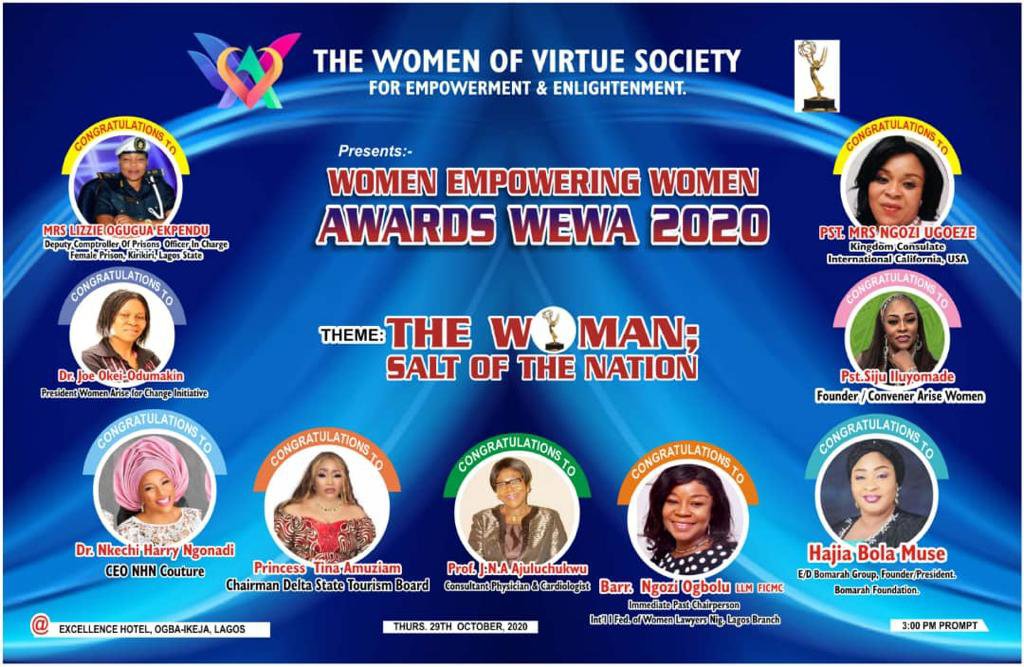 23/09/20 [post-marguee] DANIELS G. O The Women Of Virtue Society For Empowerment And Enlightenment… PRESENTS… WOMEN EMPOWERING WOMEN AWARD WEWA 2020 THEME: The Woman,Salt Of The Nation VENUE: Excellence Hotel Ogba Ikeja,Lagos. DATE: 29Th October 2020 TIME: 3pm Prompt Please Check The Postal For More Details